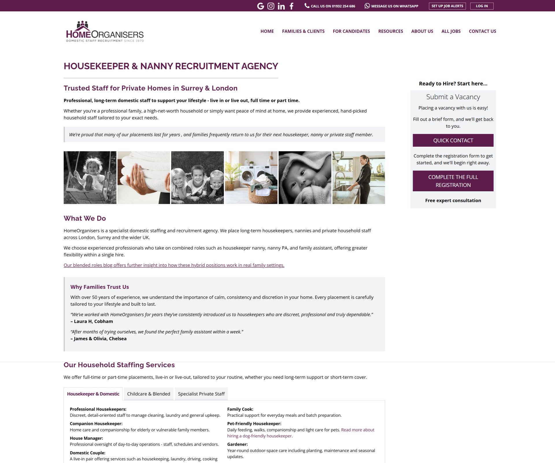 Shaun then added localised landing pages to improve the visibility in organic search results for terms like 'Housekeeper' and 'Nanny' in her chosen areas. This was particularly involving, as the website is on a specialised framework with limited features compared to our usual WordPress sites.